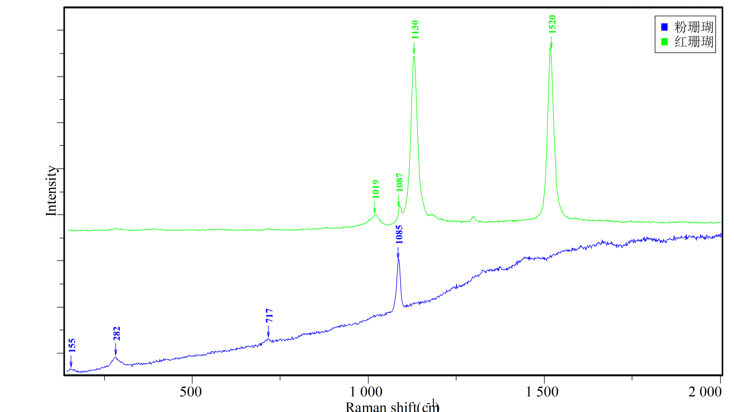 紅色、淺粉色紅珊瑚的拉曼光譜圖如下圖所示: