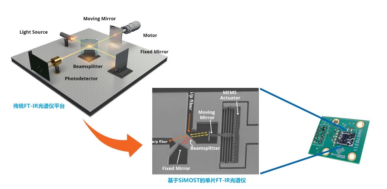 在NeoSpectra Micro 微型傅里葉紅外光譜儀中,所有光學(xué)和機(jī)械組件都集成在單個MEMS芯片上,從而實(shí)現(xiàn)芯片級FT-IR功能。 單片集成通過使用Si-Ware公司專有的硅集成微光系統(tǒng)技術(shù)(SiMOST)平臺來實(shí)現(xiàn)。