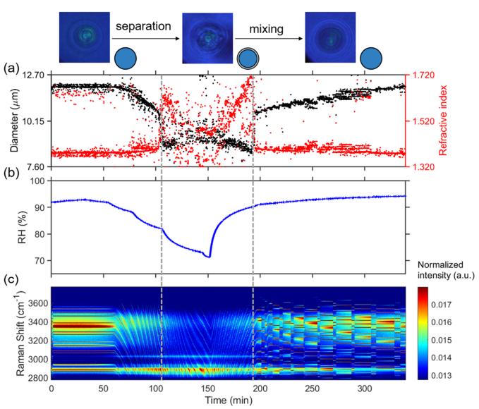 圖3. 水溶3-甲基戊二酸(3-MGA)-II的液-液相分離和混合。相態(tài)示意圖位于本圖的上方。(a) 從擬合WGMs(液滴-玻璃界面波)的拉曼位移位置確定的液滴尺寸和折射率變化的時(shí)間尺度。(b) 在濕度變化過程中,通過捕捉裝置后的相對(duì)濕度變化。(c) 時(shí)間分辨拉曼光譜。液滴內(nèi)夾雜物的隨機(jī)運(yùn)動(dòng)停止和由此導(dǎo)致的核殼結(jié)構(gòu)形成,由左側(cè)的灰色虛線指示。右側(cè)的灰色虛線作為液滴形態(tài)從相分離狀態(tài)轉(zhuǎn)變?yōu)榫酄顟B(tài)的點(diǎn)。
