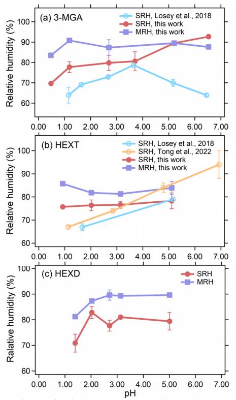 圖4.分離相對(duì)濕度(SRHs)和混合相對(duì)濕度(MRHs)作為pH值的函數(shù),對(duì)應(yīng)于(a) 3-甲基戊二酸(3-MGA)/硫酸銨(AS)系統(tǒng),(b) 己三醇(HEXT)/硫酸銨(AS)系統(tǒng),(c) 己二醇(HEXD)/硫酸銨(AS)系統(tǒng)??招膱A圈引自Losey等人(2018年)和Tong等人(2022年)的數(shù)據(jù)。SRHs和MRHs的誤差條基于多次測(cè)量得出。