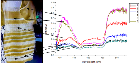 就以這個服裝的藍(lán)色(或白色)為例,其在430nm有一個反射峰,對應(yīng)藍(lán)色。在700nm后反射率升高,而每個人對700nm以上波段光的感應(yīng)是不一樣的,在700nm是人眼觀察的紅色至紅紫色區(qū)域,藍(lán)色和黃色、紅色的光混合后會出現(xiàn)白色光的結(jié)果。也就是說,有些人能對近紅外光波段區(qū)域的感應(yīng)相對寬一些(敏感一些),這就造成了衣服本身是藍(lán)色的,加上相對黃色光、紅色光感應(yīng)較為敏銳,就會造成對衣服顏色的感知為金色的(有一部分會體現(xiàn)出白色)。而紅光區(qū)域感應(yīng)相對不敏銳的人則只能夠看到與原來圖像一致的黑色和藍(lán)色。