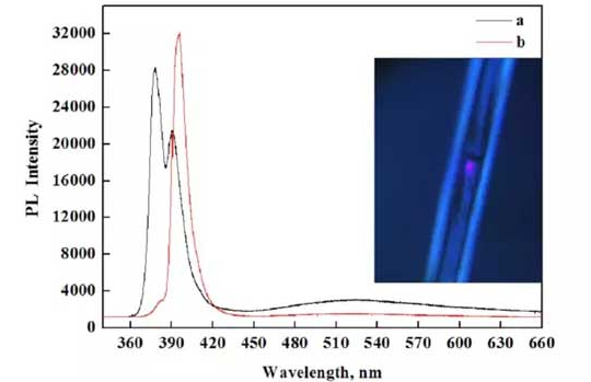 作為第三代半導(dǎo)體材料的典型代表,GaN藍(lán)光材料一直是近年來研究的熱點(diǎn)。ZnO和GaN同為穩(wěn)定的六角纖鋅礦結(jié)構(gòu),室溫下的禁帶寬度為3.37eV,激子束縛能高達(dá)60meV,即使在室溫甚至高于室溫下也能實(shí)現(xiàn)高效的激子發(fā)射。因而,ZnO成為制備紫外發(fā)光器件(LEDs)、紫外激光器(LDs)等短波長光發(fā)射器件的主要候選材料。圖2和圖3為不同條件下制備的ZnO微米管的PL光譜,測試儀器采用北京卓立漢光自主研發(fā)生產(chǎn)的Flex One“微光”系列顯微光致發(fā)光光譜儀,激發(fā)光源選用325nm HeCd激光器。