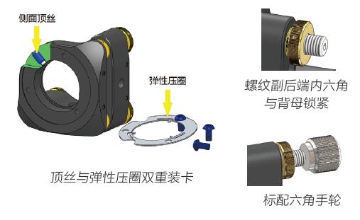 • 雙重裝卡:特別設(shè)計(jì)了彈性壓圈壓緊鏡片的裝卡方式,一定程度上可避免頂絲或硬性固定引起鏡片變形,提高光路穩(wěn)定性;如果您不想使用彈性壓圈,可自行將彈性壓圈取出,用側(cè)面頂絲固定即可