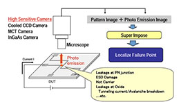 半導(dǎo)體器件和電路制造技術(shù)飛速發(fā)展,器件特征尺寸不斷下降,而集成度不斷上升。這兩方面的變化都給失效缺陷定位和失效機(jī)理的分析帶來(lái)巨大的挑戰(zhàn)。對(duì)于半導(dǎo)體失效分析(FA)而言,微光顯微鏡(Emission Microscope, EMMI)是一種相當(dāng)有用且效率極高的分析工具。微光顯微鏡其高靈敏度的偵測(cè)能力,可偵測(cè)到半導(dǎo)體組件中電子-電洞對(duì)再結(jié)合時(shí)所發(fā)射出來(lái)的光線(xiàn),能偵測(cè)到的波長(zhǎng)約在350nm ~ 1100nm 左右。 它可以廣泛的應(yīng)用于偵測(cè)IC 中各種組件缺陷所產(chǎn)生的漏電流,如: Gate oxide defects / Leakage、Latch up、ESD failure、junction Leakage等。EMMI的工作原理圖如下:
